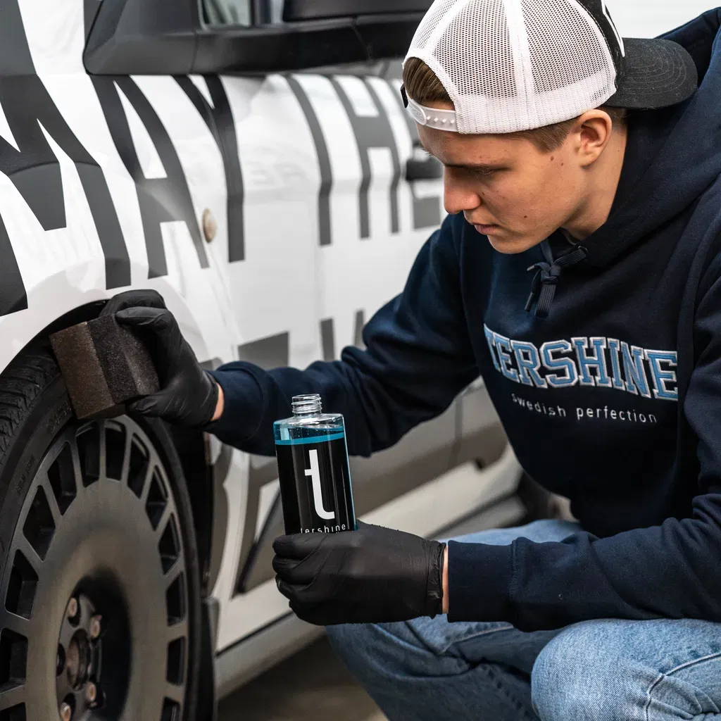 Riktigt smutt däck och plast-applikator av bra kvalitet. Lite tjockare så man slipper gegga ned händerna samt att den täcker bra även på större fordon så som lastbilar, hjullastare mm. Ett måste tillsammans med Refined - Rubber & Trim. Går galant att klippa med en sax om man vill ha den mindre.