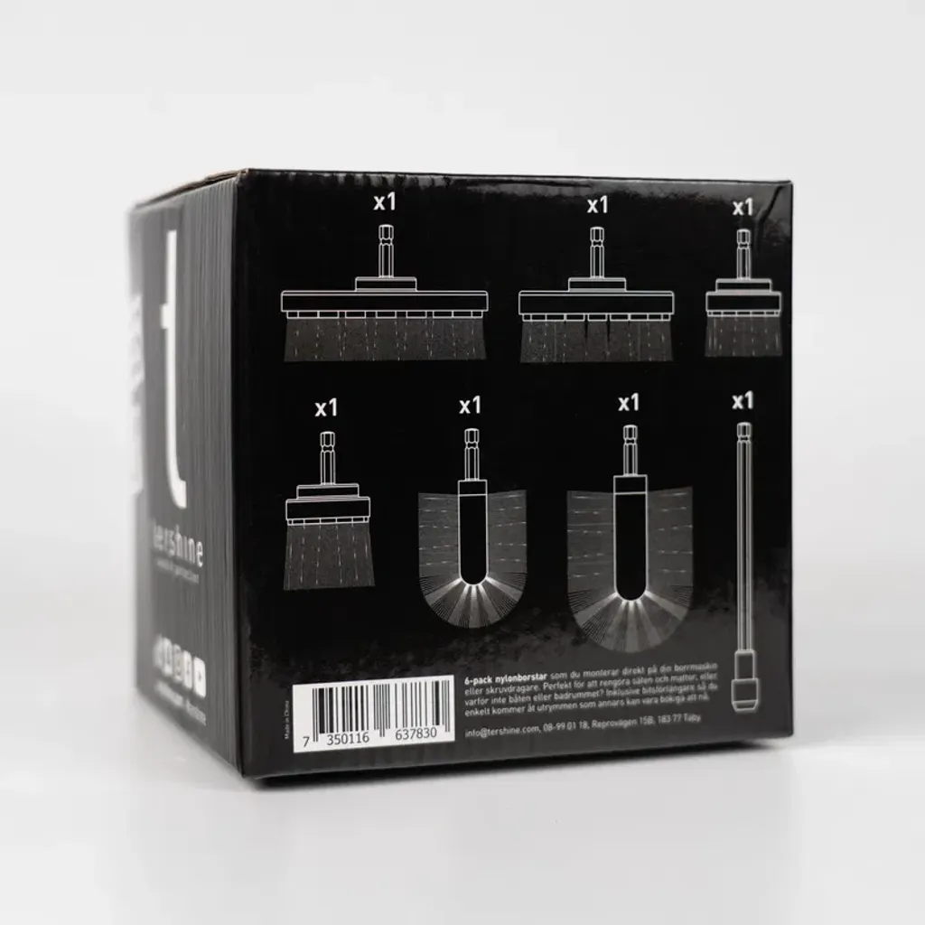 6-pack nylonborstar som du monterar direkt på din borrmaskin eller skruvdragare. Perfekt för att rengöra säten och mattor, eller varför inte båten eller hemmet/uteplatsen? Inklusive 15cm bitsförlängare som gör att du kommer åt utrymmen som annars kan vara bökiga att nå.