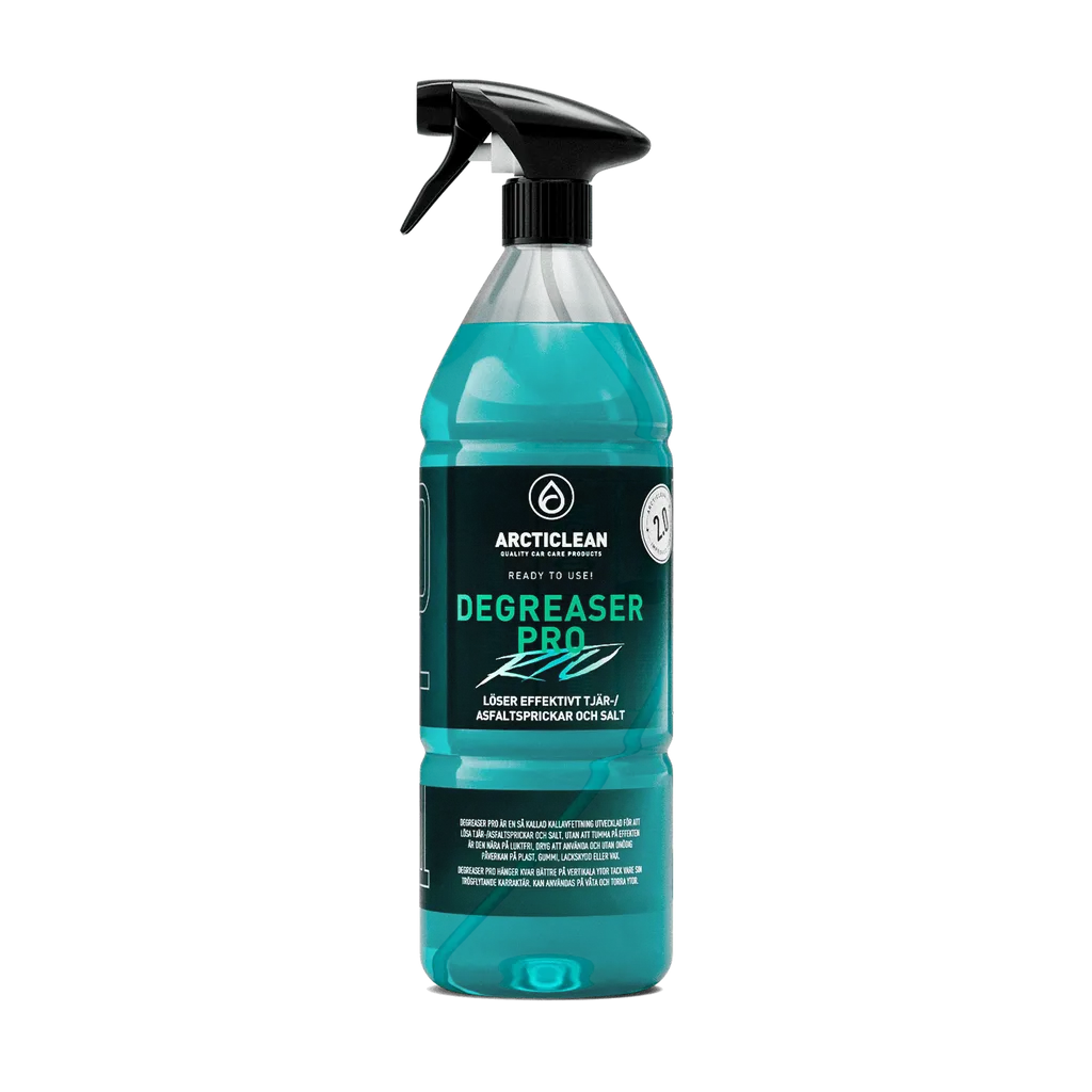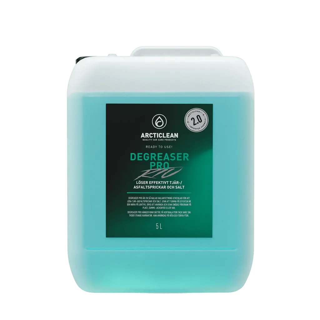 Vår uppdaterade Degreaser Pro tar hand om smutsen på en helt ny nivå. Med sin förbättrade sammansättning är den ännu mer effektiv mot tuffa fläckar som salt, tjära, asfalt, asfaltsprickar, fett, olja och silikoner. Vi är stolta över att erbjuda dig den ultimata moderna kallavfettningen! Denna kallavfettning är otroligt enkel att använda. Bara spraya på, låt den verka och skölj sedan av. Vår Degreaser Pro är skonsam mot alla typer av hårda material och ytor såsom lack, plast, aluminium, krom och övriga lackade ytor. (P.g.a. utsträckning av problem med känsliga lyktor på ex. VAG-bilar vågar vi inte garantera hållbarhet på dessa – men vi har tvättat hundratals utan några problem). Degreaser PRO är lagom trögflytande, vilket gör att den hänger kvar längre, torkar inte ut och verkar under en längre tid. Dessutom är den nästintill doftfri för en behagligare användarupplevelse. Degreaser Pro är det perfekta valet för alla som vill använda en kallavfettning som är både effektiv och säker.
