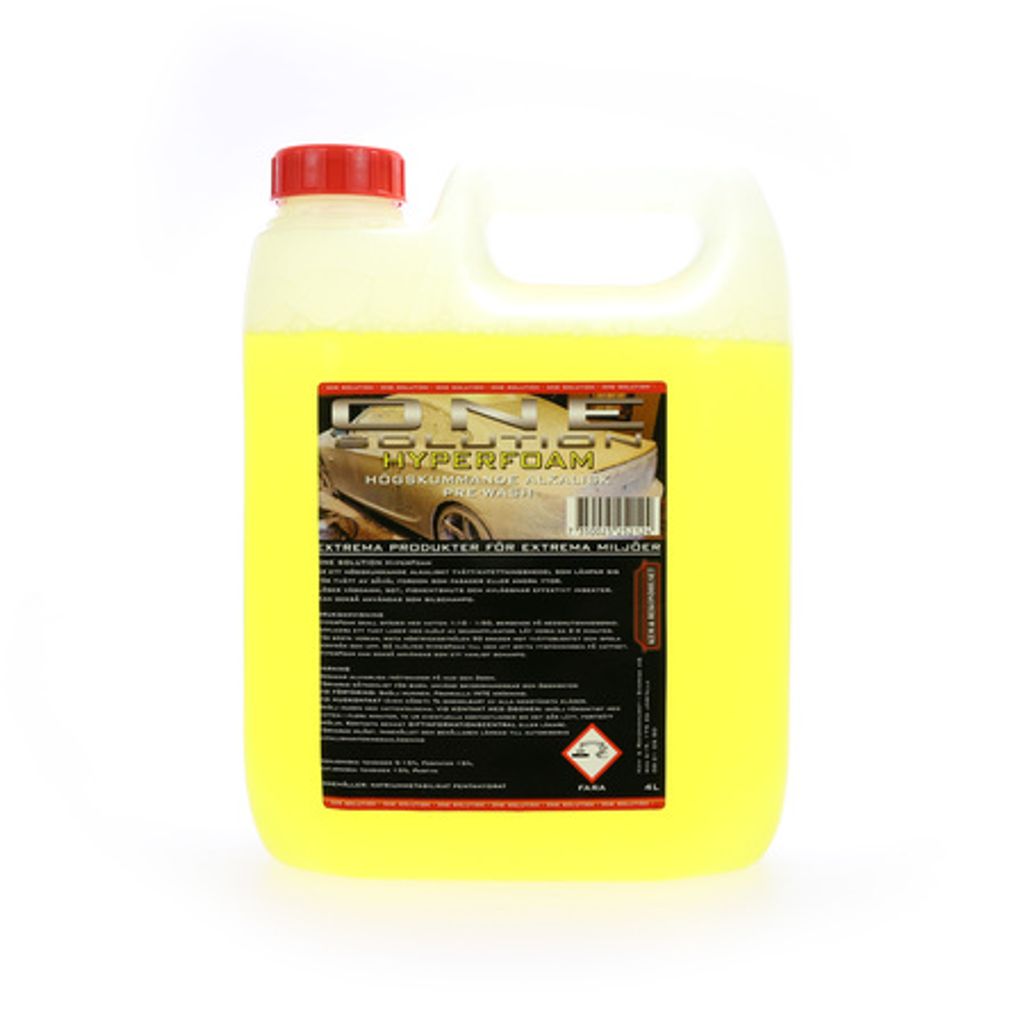 One Solution Hyperfoam alkalisk avfettning är högskummande Tvätt/avfettningsmedel som lämpar sig för tvätt av såväl fordon som fasader eller andra ytor. Löser effektivt upp vägdamm, sot, insektsrester och annan organisk smuts. Medlet skapar ett tjockt skum som ligger kvar länge och verkar på ytan. One Solution Hyperfoam alkalisk avfettning används tillsammans med foam lance för bästa rengöringsförmåga. Kan även användas som ett vanligt bilschampo, med tvätthandske och tvätthink. One Solution Hyperfoam alkalisk avfettning späds med vatten (1:10–1:50, beroende på graden av smutsighet) i foam lancens flaska. Prova dig fram för att hitta det blandningsförhållande som passar dig. Justera med ställskruven på foam lancen så att du får ett bra skum. Applicera ett jämnt lager över hela bilen och låt verka i ca 2–4 minuter innan du spolar av med rent vatten.