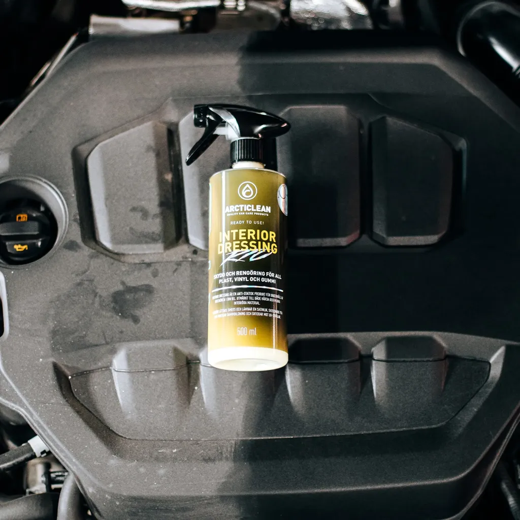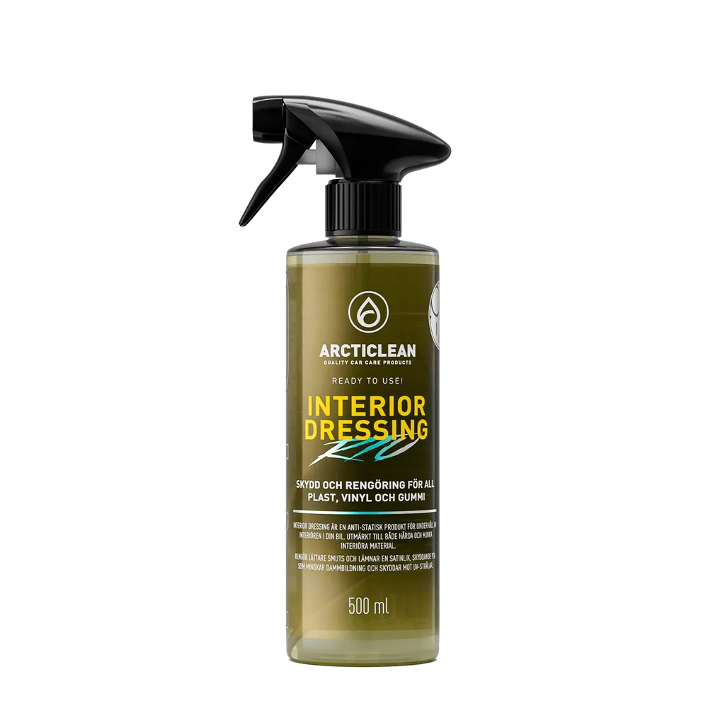 Vår Interior Dressing kommer nu med en uppdaterad och ännu effektivare formula samt en ny snyggare etikett. Den rengör, återställer och skyddar plast, vinyl och gummi i din bils interiör, och lämnar en original liknande, UV-blockerande yta. Perfekt även för utvändig plast och gummi! Den antistatiska formulan tar enkelt bort lättare smuts och kan sprayas direkt på ytan eller appliceras med en mikrofiberduk. Vi rekommenderar vår Multi Purpose Cloth eller Interior/Glass Cloth för bästa resultat. Interior Dressing - nu ännu mer effektiv och del av vår RTU-serie!
