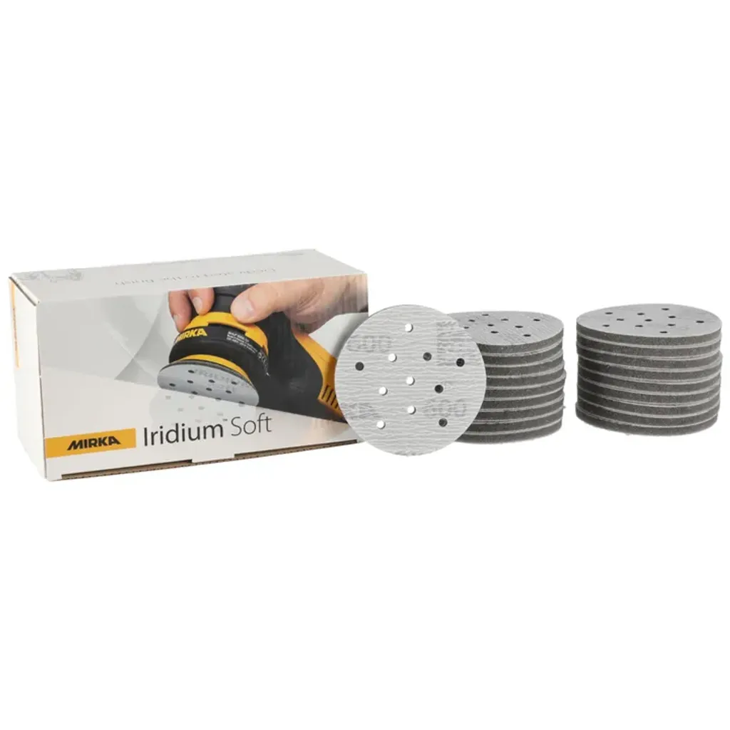 Mirka Iridium™ Soft har en tredelad konstruktion med en slipyta gjord av hållbara aluminiumoxidkorn, en flexibel skumbas och en baksida med säkert grip-fäste. Genom att använda Mirkas Multifit™-hålkonfiguration ger detta effektiv slipning med mindre igensättning, pillerbildning och virvelmärken.