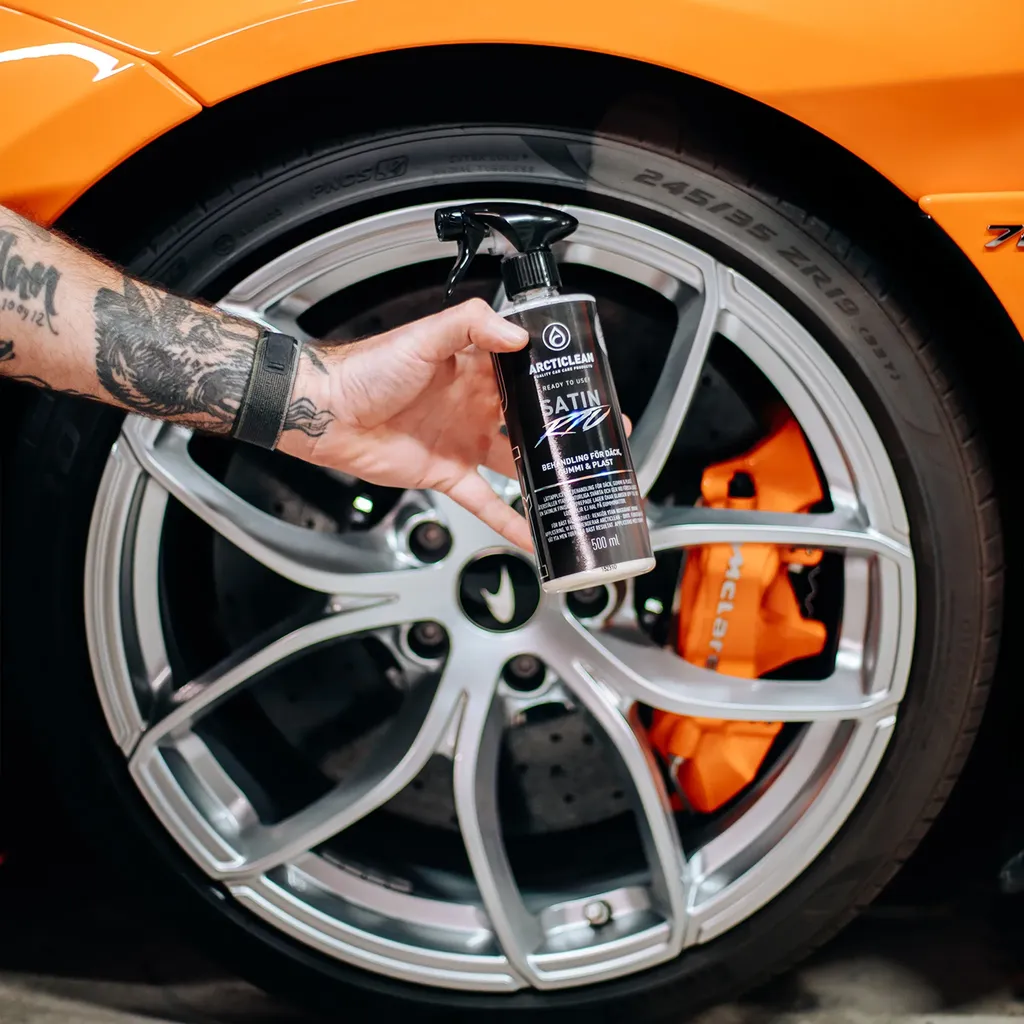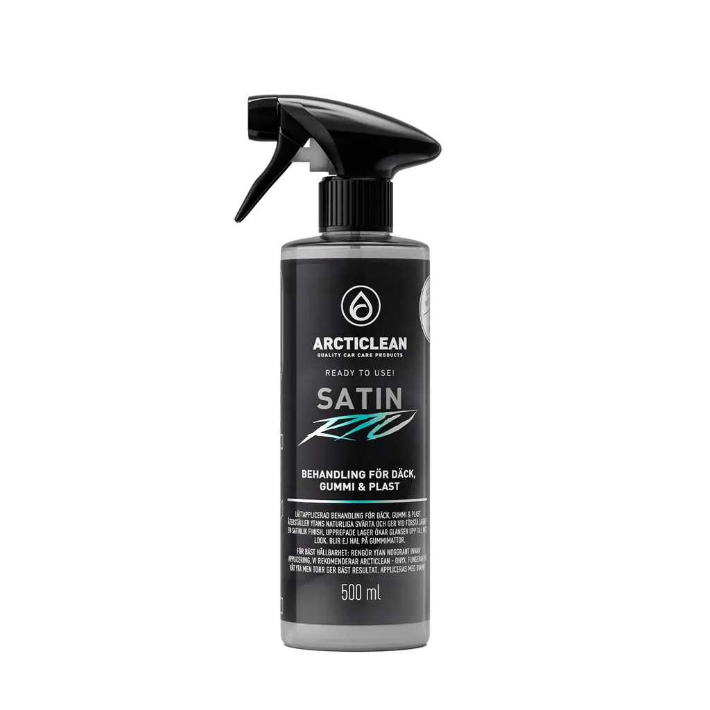 Satin är vår nya keramiska behandling för däck, gummi och plast. Väldigt lätt att lägga och återställer ytans naturliga svärta och ger vid första lagret en satinlik “orginal” finish, Upprepar man kan man få en blankare yta med mer wetlook.