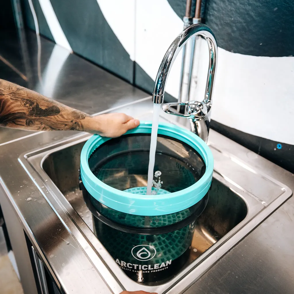 Arcticleans tvätthink rymmer 15 liter och levereras komplett med grit guard och ett skruvlock. Hinken är tillverkad i kraftig plast för att tåla frekvent användning.